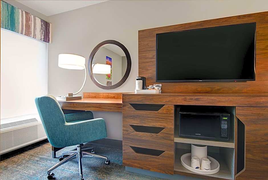 This room features a flat-screen TV, mini fridge, work desk, ironing facilities, and ergonomic chair.